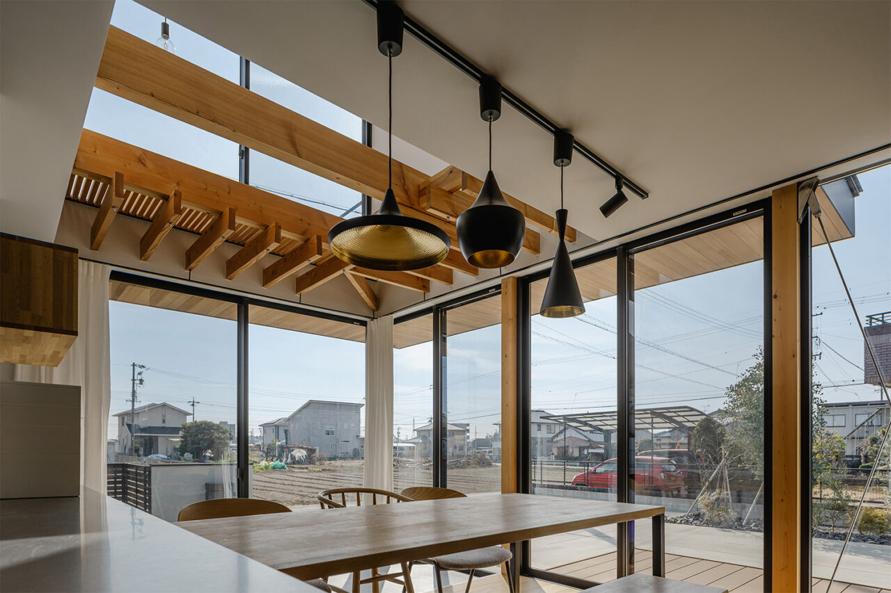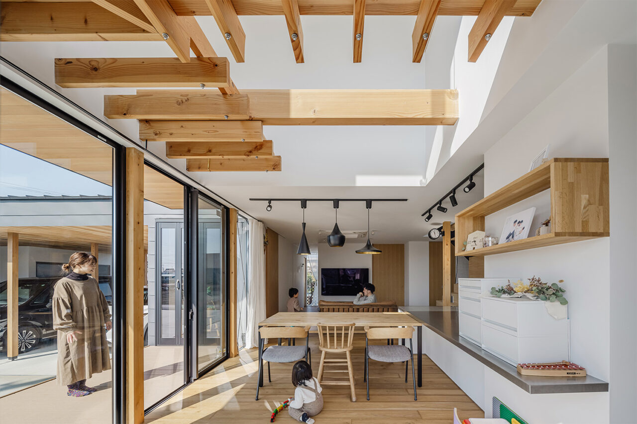 土間と吹き抜け、大開口によって庭と空を引き込み、庇の木構造をあらわしにすることで、構成そのものが遊び場のような表情を生んでいる。