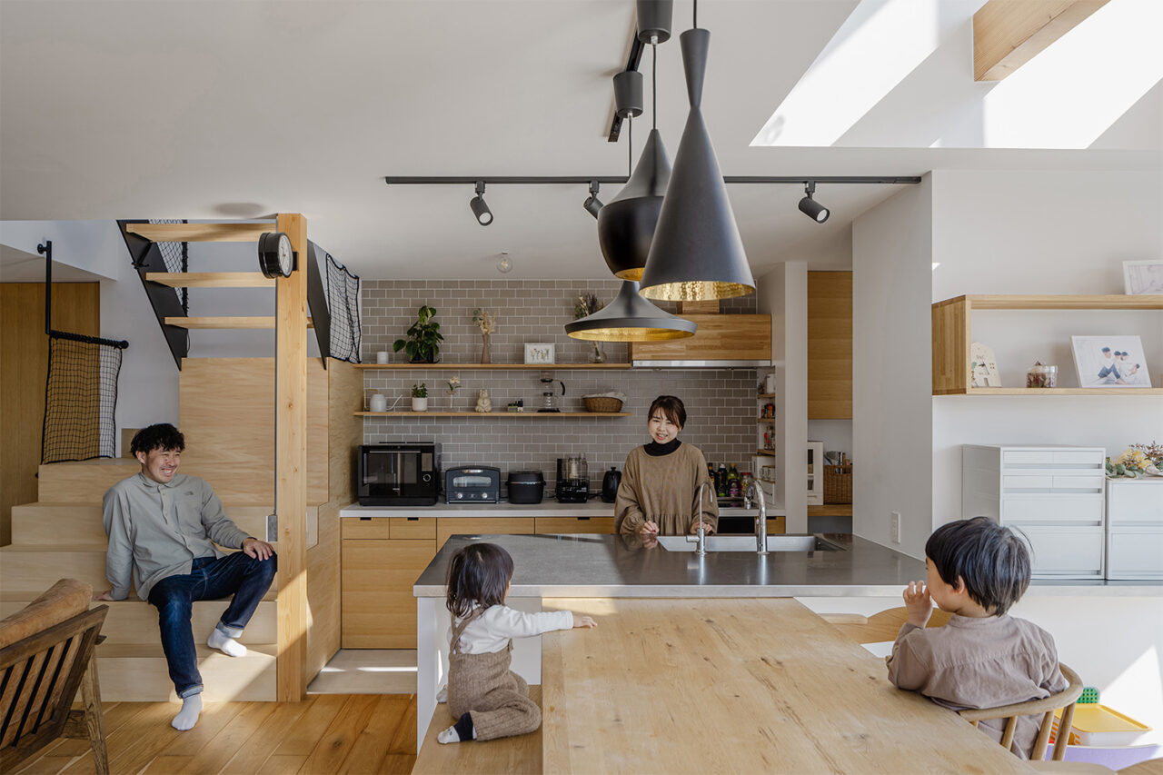 家族や友人が自然と集まり、賑わいを受け止める場をつくりたいという住まい手の想いから、家の中心に「ひろば」のような空間を据えた。